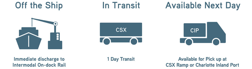 The Queen City Express simplifies logistics. It provides service from the Port of Wilmington to Charlotte Inland Port – an intermodal shipping hub with direct access to major distribution corridors in the Southeastern U.S. It also offers reduced transit costs and no dwell times at either location. That’s smooth sailing, from sea to city. Both ways. Every day.